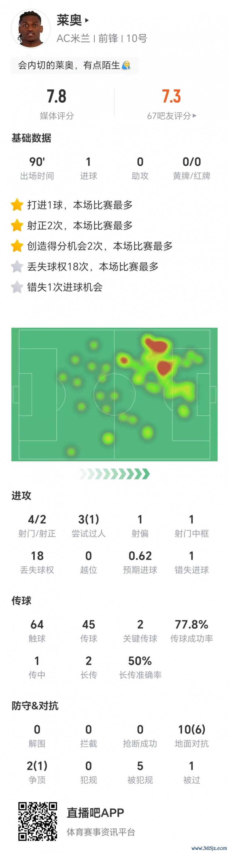 赛后时间统计数据深远,莱奥本场4射两正,1次射偏1次中框,两次要津传球,10次大地抵抗成效6次,获评7.8分。