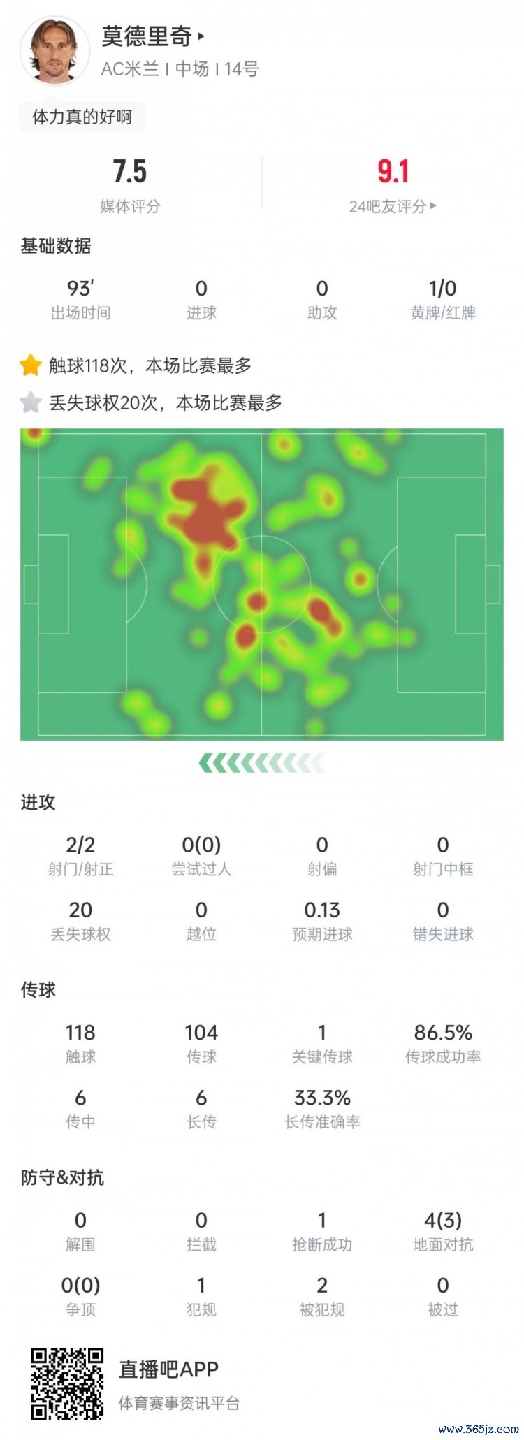 莫德里奇数据:触球118次全场最多,4次回击3次奏效,获评7.5分