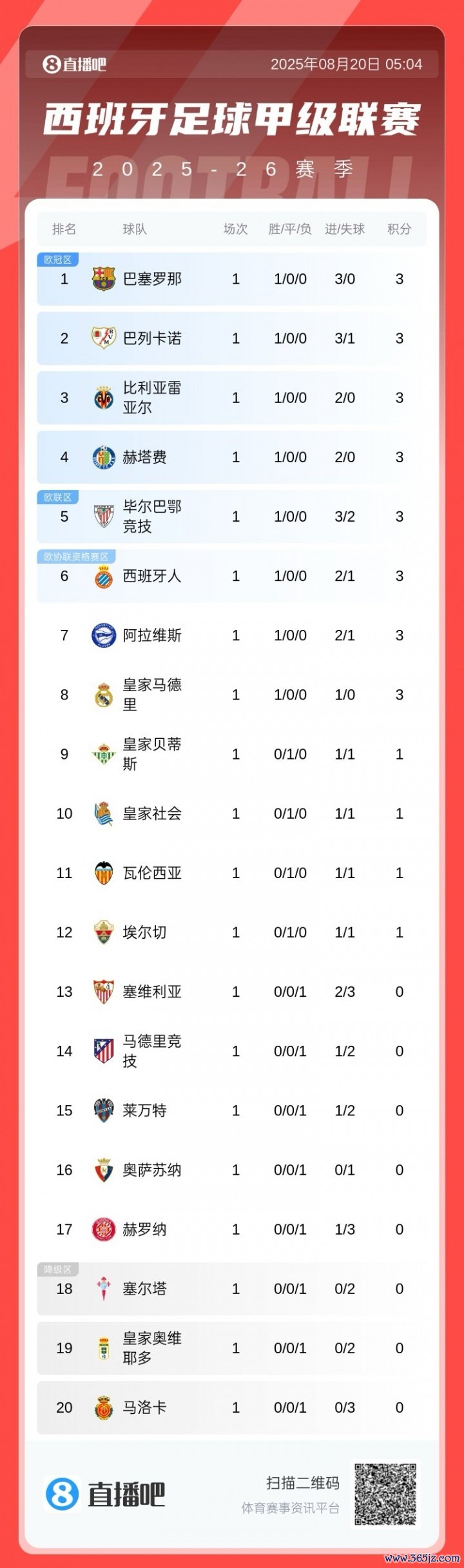 08月20日讯 本日西甲首轮,皇马1-0奥萨苏纳取开门红。至此西甲第1轮一都遏抑,巴萨3-0客胜马洛卡领跑积分榜,马竞1-2遭西班经纪东说念主逆转排第14。最新积分榜如下: