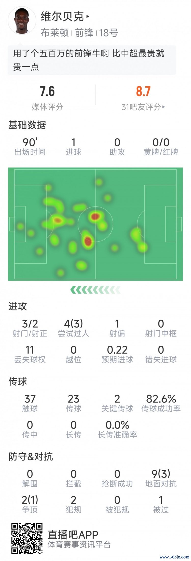 10月26日讯 在本轮英超,布莱顿2-4不敌曼联,以下为维尔贝克本场数据: