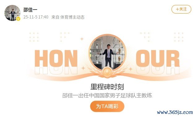邵佳一的个东说念主微博更新了他新的里程碑技术:邵佳一出任中国国度须眉足球队主阐明。
