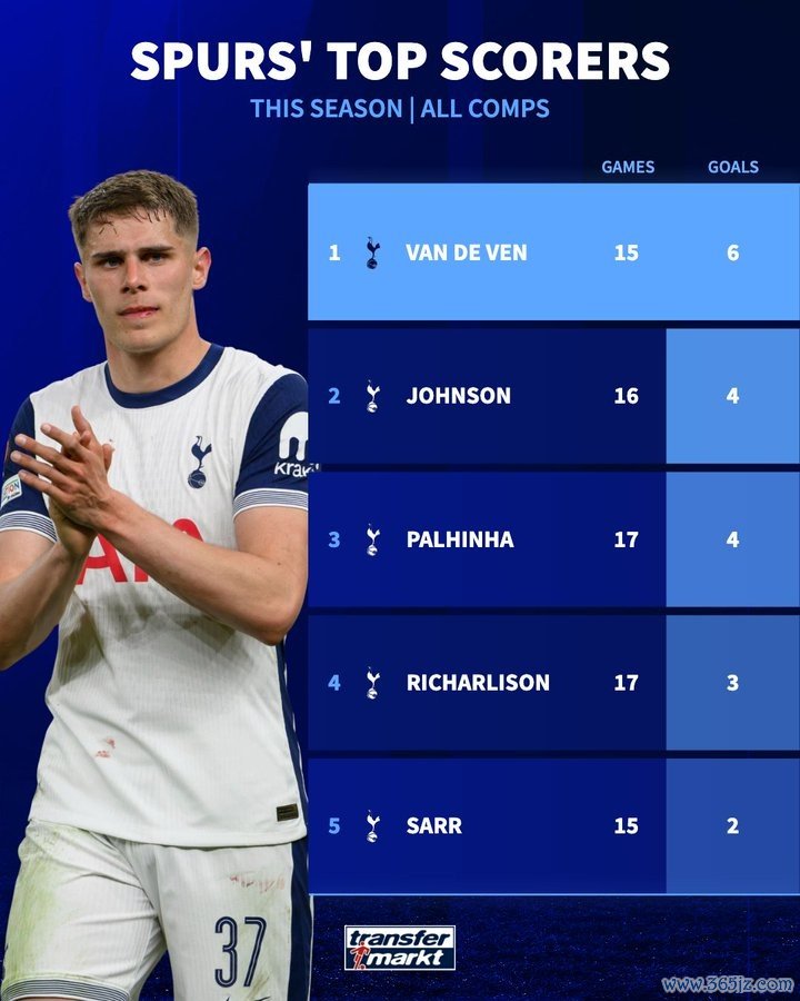 本赛季热刺队内弓手榜:中卫范德芬6球居首,约翰逊、帕利尼亚4球