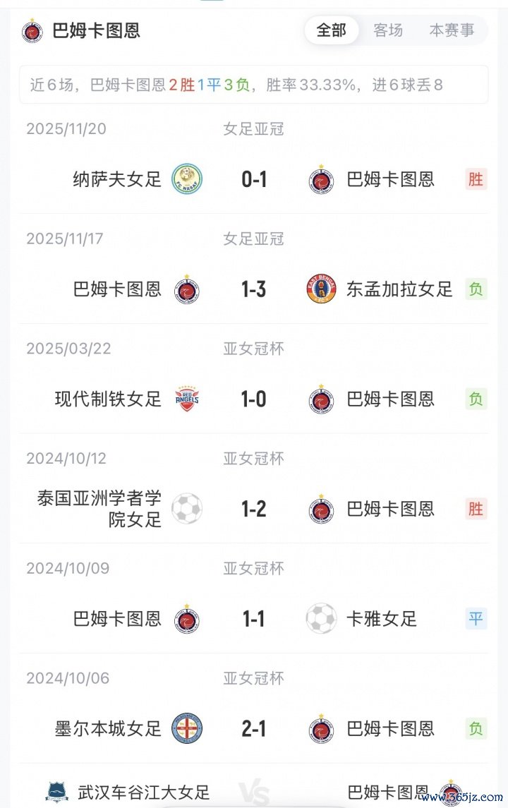现在,武汉车谷江大女足1胜1平积4分名次B组第1,巴姆卡图恩1胜1负名次B组第3,两边暂无交锋历史。