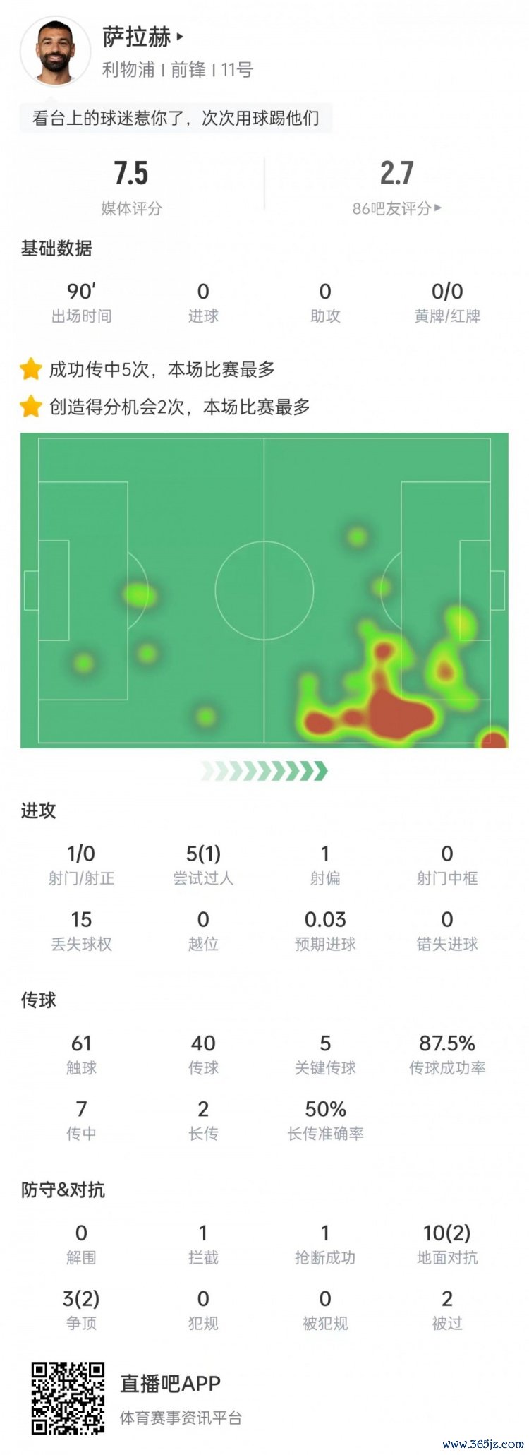 萨拉赫本场数据:5次过东谈主1次见效,5次环节传球,获评7.5分