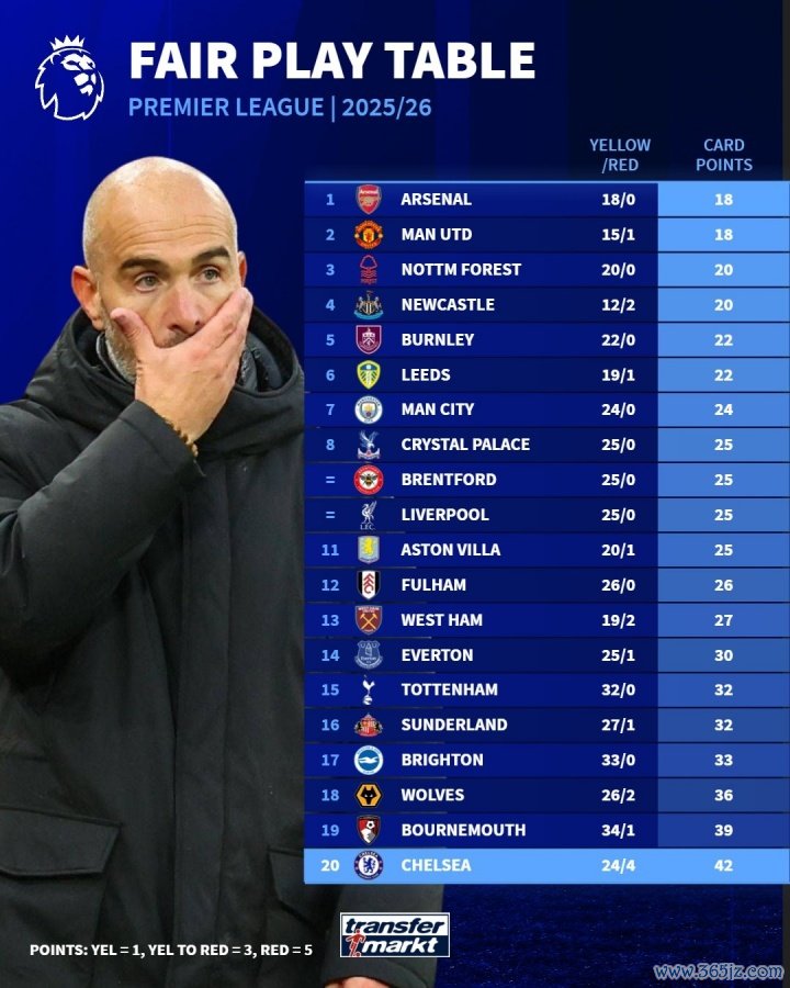 在公正竞赛积分榜上,阿森纳本场比赛吃到6张黄牌,但仍名按序一,而切尔西本场比赛吃到1黄1红,名次公正竞赛榜倒数第一。
