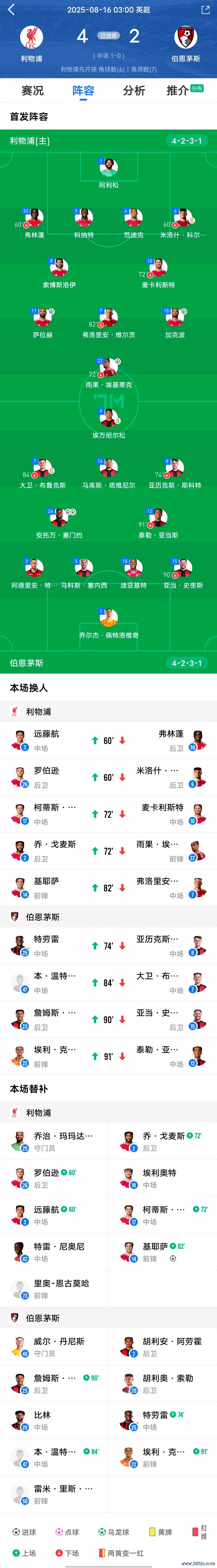 利物浦揭幕战4-2险胜樱桃 埃基蒂克传射基耶萨立功