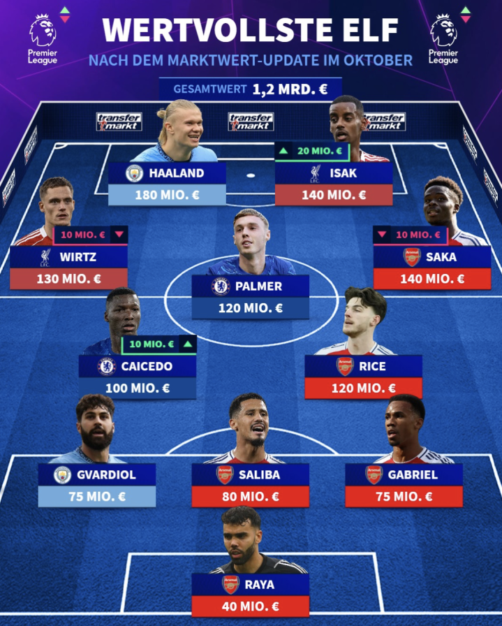 虎扑10月17日讯德转公布了英超身价最高的十一东谈主。声势总身价为12亿欧元,曼城的哈兰德以1.8亿领衔声势。