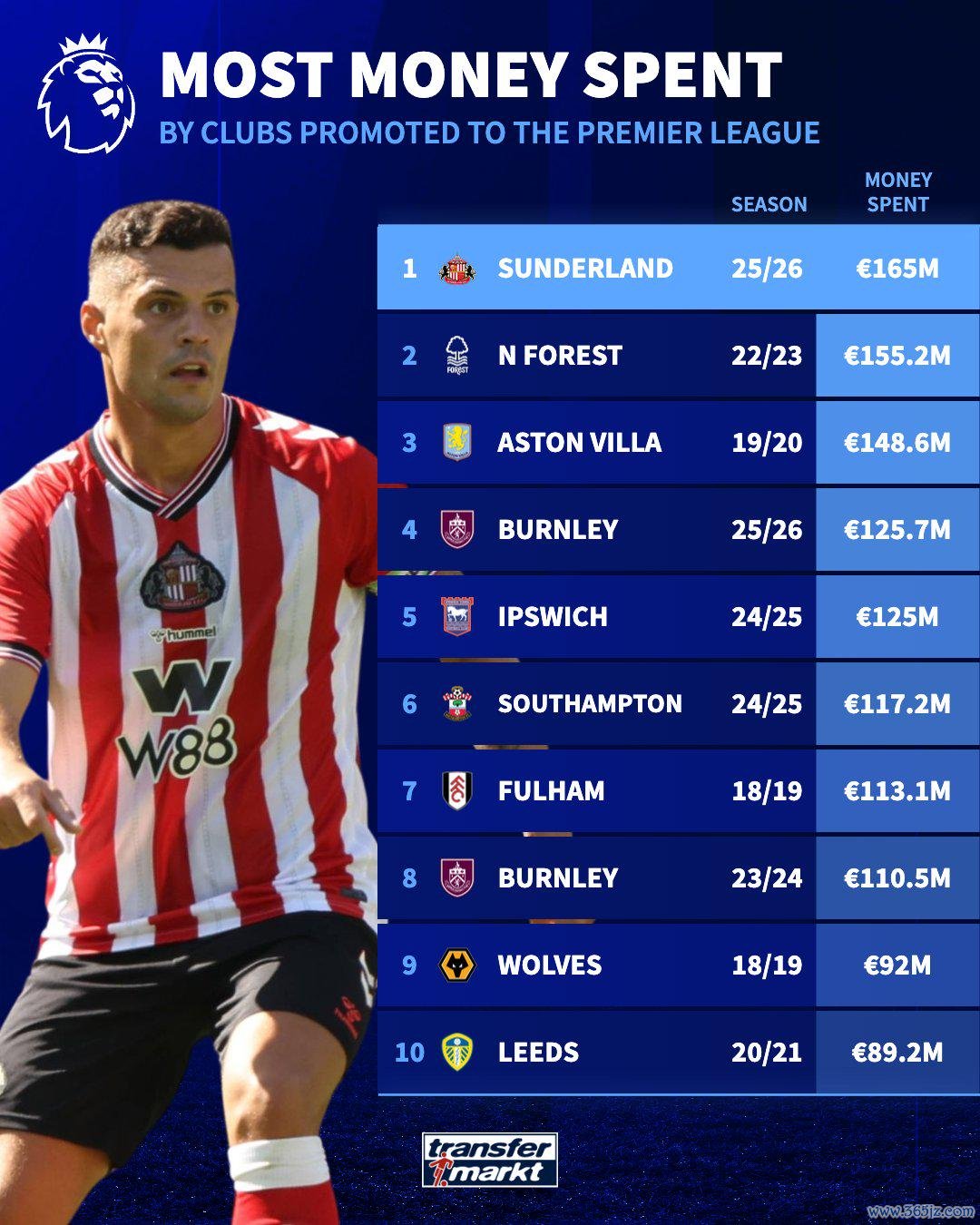 1 桑德兰(2025/26赛季)-1.65亿欧元;