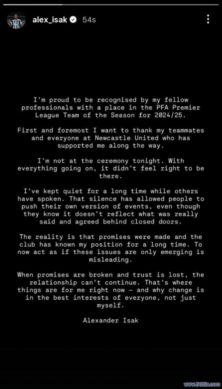 伊萨克社媒发表声明,表示为何莫得出席PFA受奖典礼,况兼谈及我方的转会传说。