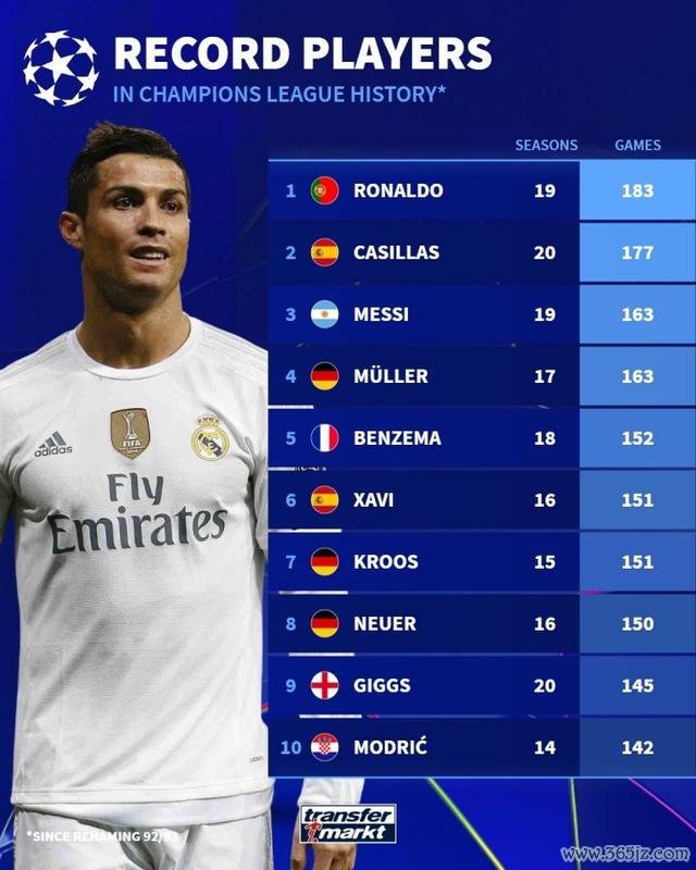 直播吧09月16日讯 整宿,新赛季欧冠就将打响。德转在赛前哨出了欧冠历史出场榜,C罗以183场位列榜首,卡西、梅西分列二三。