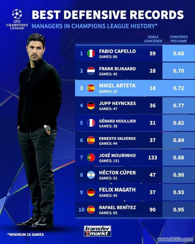 阿尔特塔带阿森纳参预25场欧冠仅丢18球,场均0.72球排在历史第三