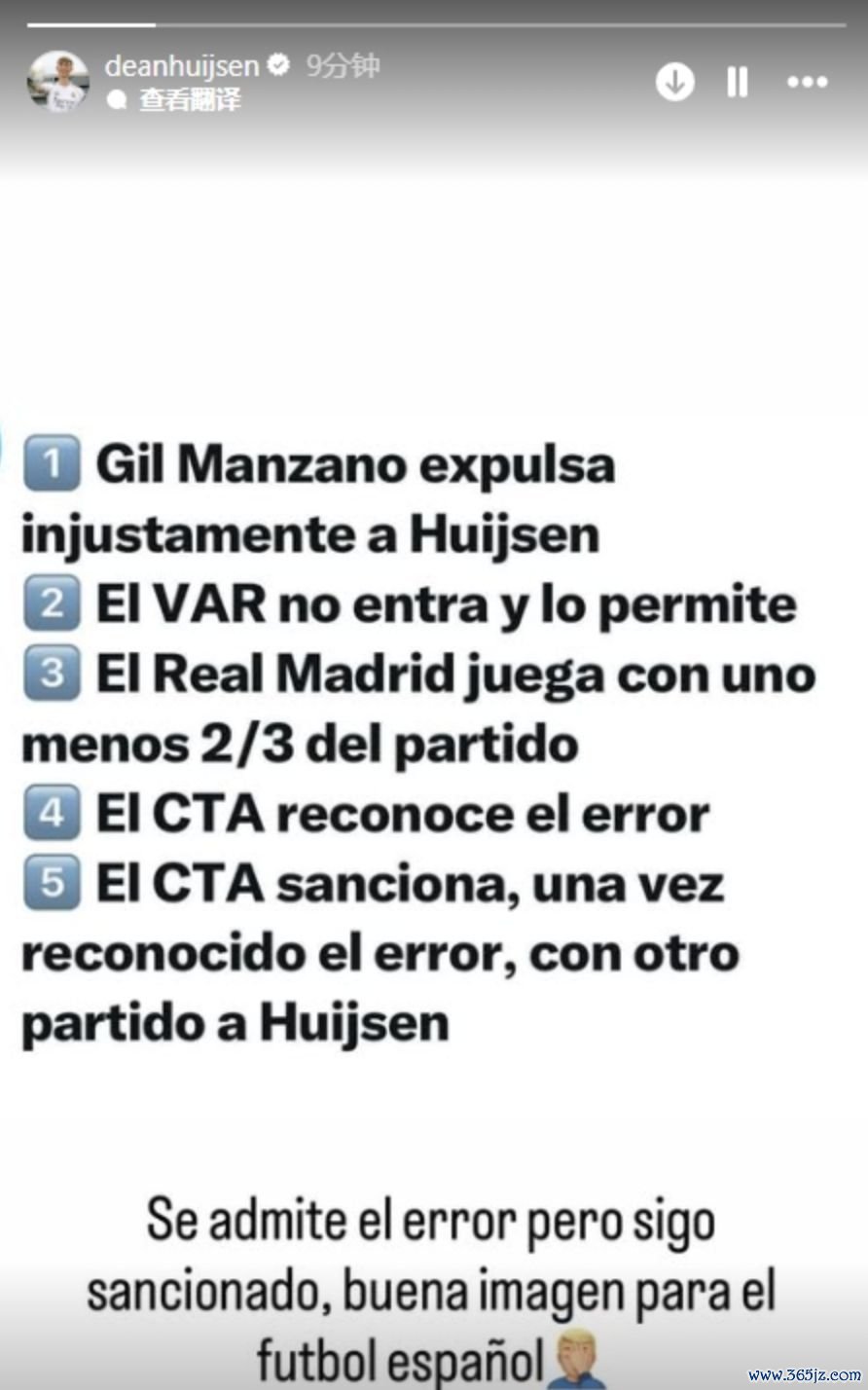 与此同期,赫伊森本东谈主也在社媒发声。他这么写谈:“主裁判曼萨诺不公谈地将赫伊森罚下。VAR不介入。时代委员会承认了误判,但保管对赫伊森的禁赛。归来:承认诞妄,但我已经要罚你,确切给西班牙足球长脸。”