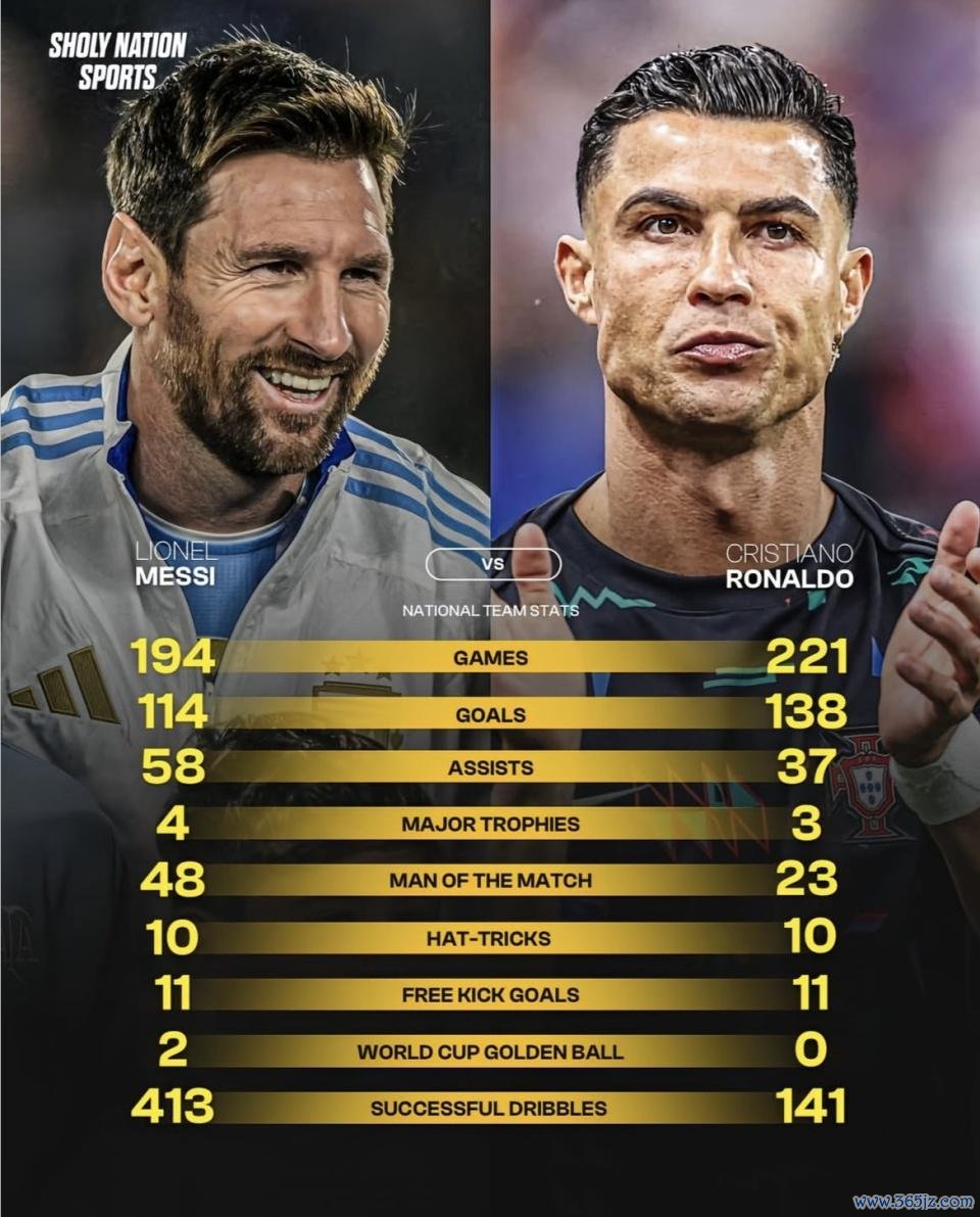 梅西与C罗在国度队层面的分野,并不仅仅谁进球更多这样简便。把中枢数据逐条摆开你会看到:C罗在出场与进球上更“硬核”,而梅西在助攻、场均制造进球、全场最好与过东谈主等模范明显占优,况且荣誉维度更“全”。接下来先看了了“谁多谁少”,再插足真确影响评价的关键相反。(数据铁心北京时辰2025年9月6日)