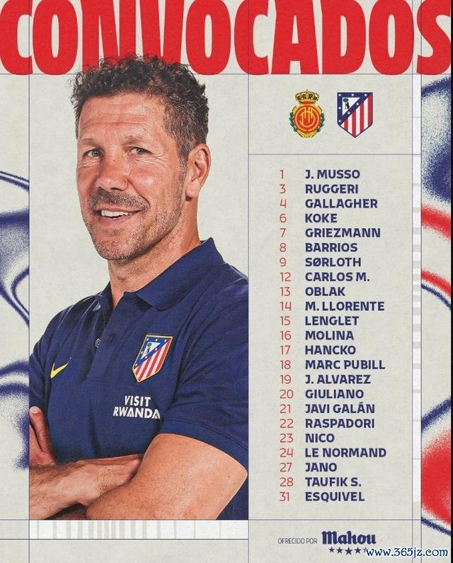 马竞联赛大名单:小蜘蛛复出,格列兹曼、加拉格尔、科克在列