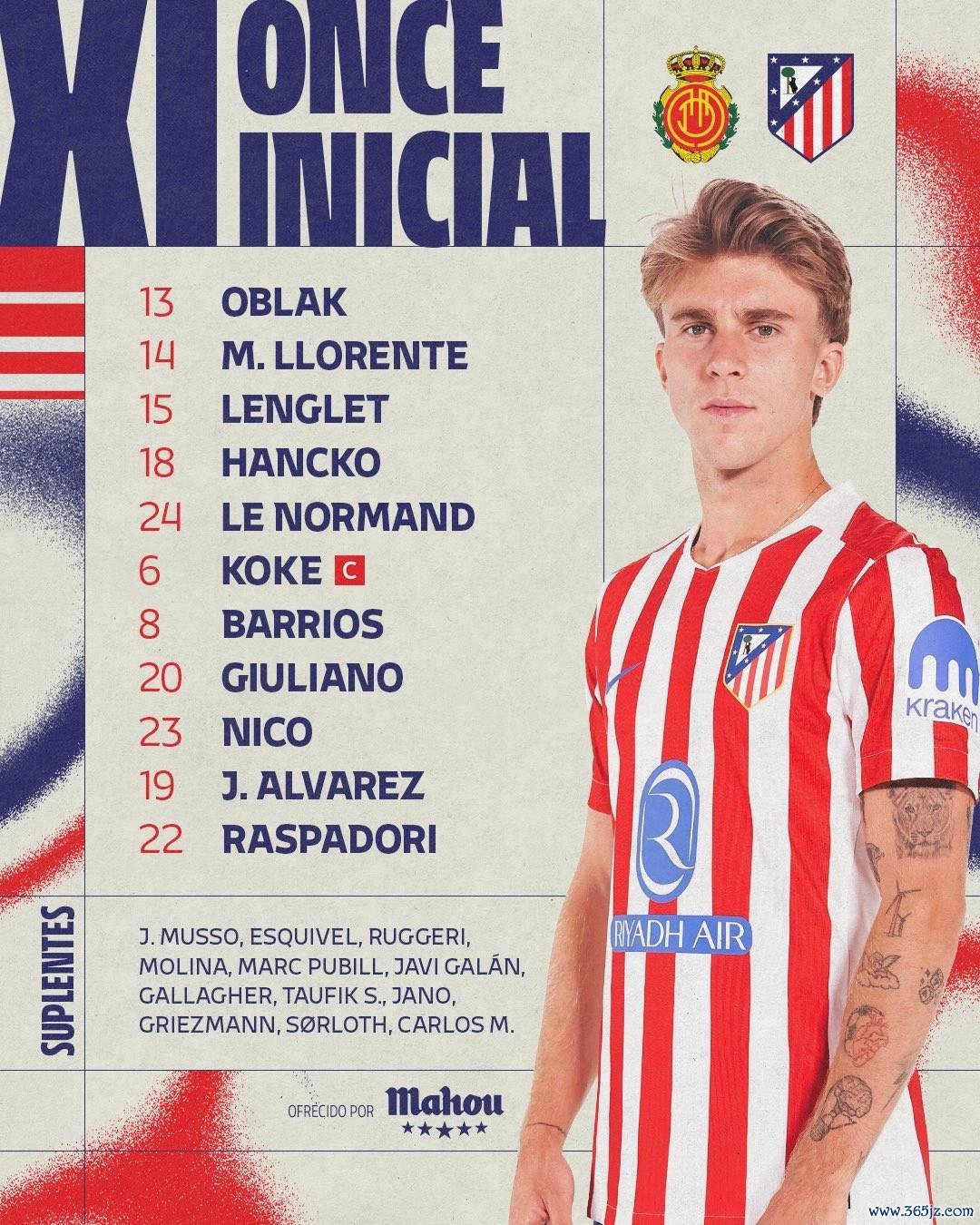 北京时间9月21日21:15,西甲第5轮,马竞客场挑战马略卡。赛前,马竞首发公布如下:
