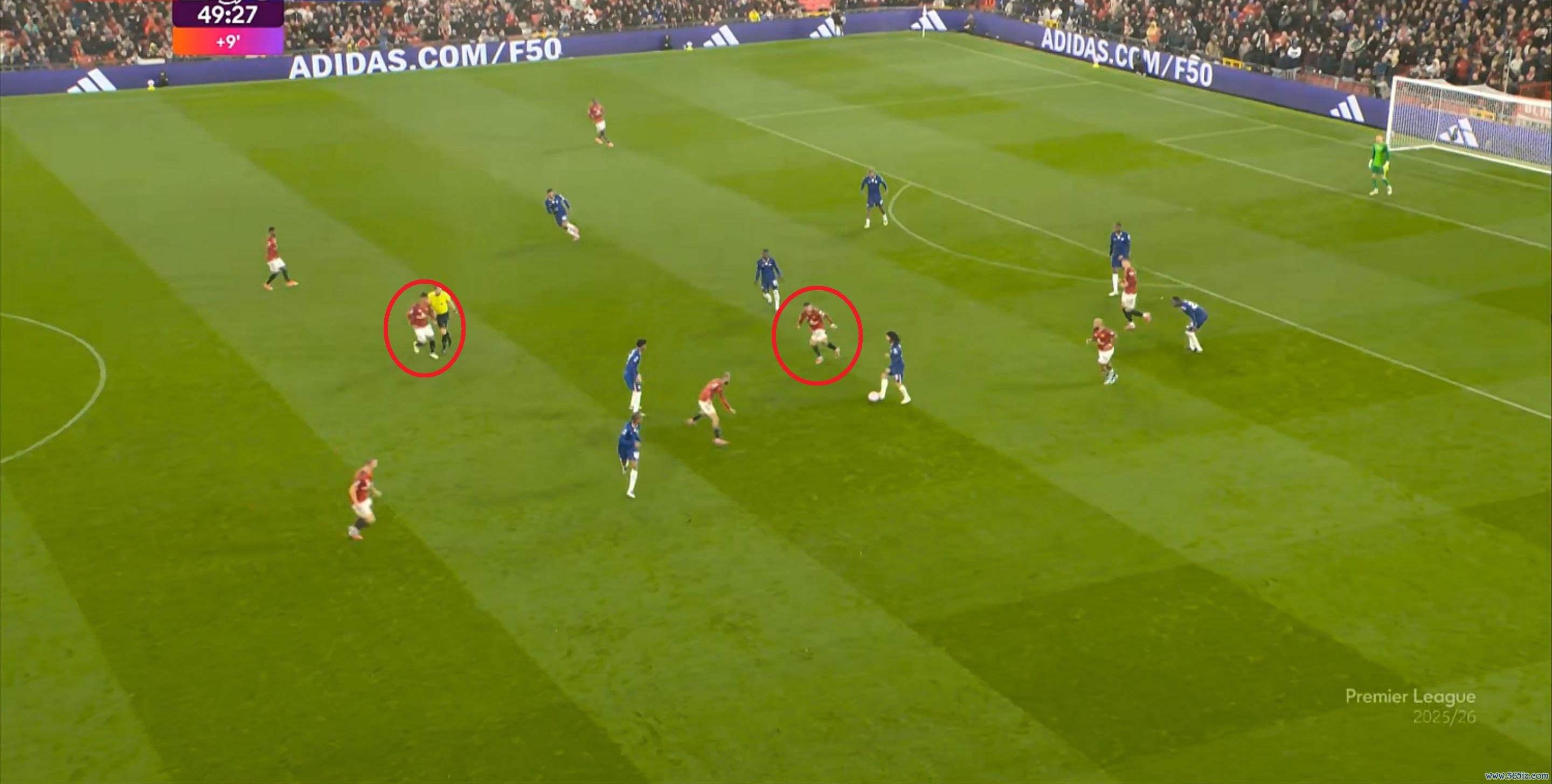 是以到了下半场,曼联也变成了10东谈主作战,在不修改三后卫体系的情况下,和切尔西一样,也失去了戒指外围区域的才智。