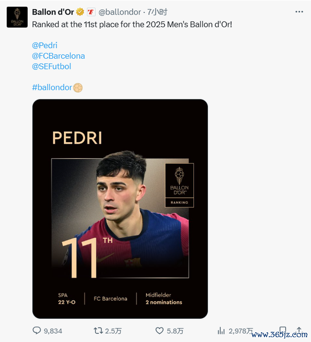 “佩德里第11”的推文,有近1万条辩论,2.5万次转发,3000万次浏览。这么的热度,比金球奖得主登贝莱还高——晓示登贝莱获奖的推文,9400条辩论,960万次浏览。
