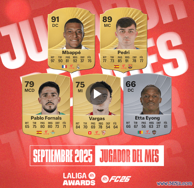 虎扑09月24日讯EA旗卑鄙戏FC26集中LALIGA公布了的西甲9月最好球员提名。皇马先锋姆巴佩和巴萨中场佩德里领衔。