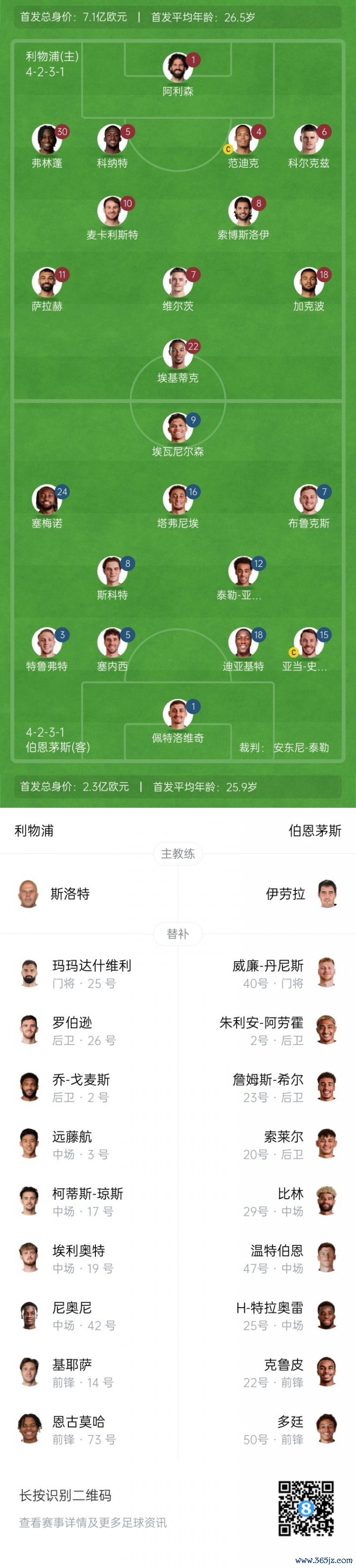 利物浦首发:1-阿利森、30-弗林蓬、5-科纳特、4-范迪克、6-科尔克兹、10-麦卡利斯特、8-索博斯洛伊、11-萨拉赫、7-维尔茨、18-加克波、22-埃基蒂克