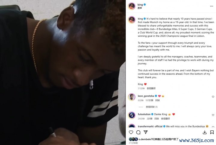 科曼发文牍别拜仁:十年时光悄然荏苒,拜仁恒久是我人命一部分