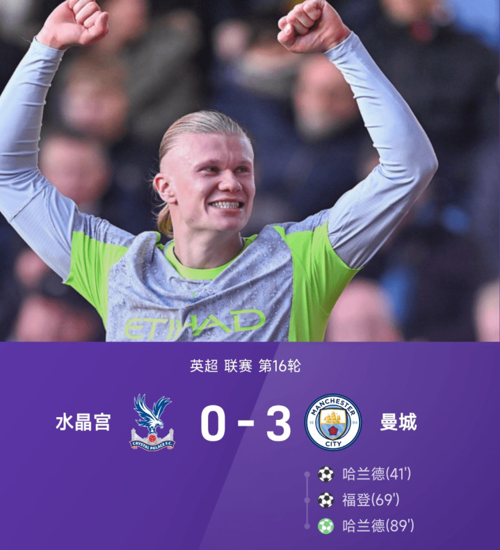 曼城3-0水晶宫:哈兰德双响,福登贴地斩锁定胜局