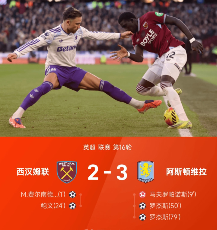 维拉3-2西汉姆联:9连胜收官,罗杰斯双响+寰球波制胜