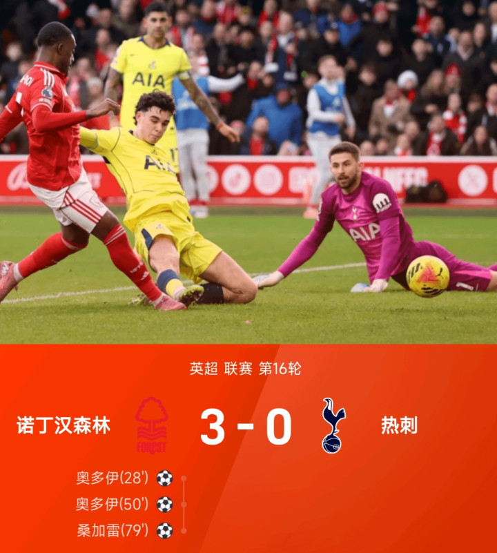诺丁汉丛林3-0热刺:奥多伊双响+寰球波,桑加雷诚心诚意