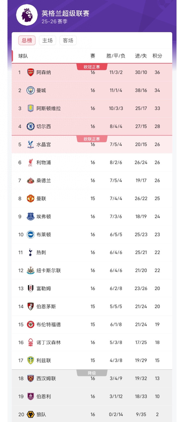 25/26赛季英超联赛第16轮多场焦点战隔断,积分榜方法迎来小幅变动。阿森纳本轮2-1打败狼队,以36分稳稳占据积分榜榜首位置 。曼城客场3-0大捷水晶宫后,积34分接续位列次席,与阿森纳的分差保持在2分 。阿斯顿维拉客场逆转西汉姆联后,各项赛事豪取9连胜,积33分名依次三;诺丁汉丛林主场3-0完胜热刺,凭借这场告捷拉开与保级队区距离,英超赛场竞争依旧是非。