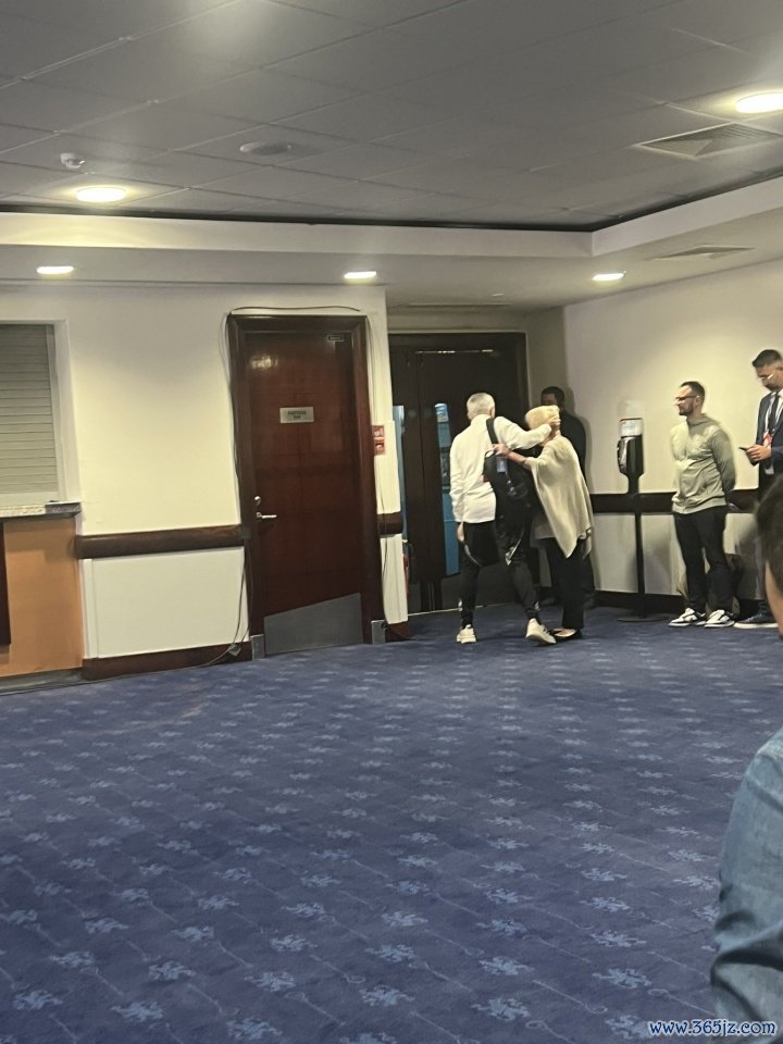 在欧冠新闻发布会截至后,穆里尼奥与切尔西的新闻官特蕾莎-康妮莉拥抱,取得了在场其他东说念主的掌声。