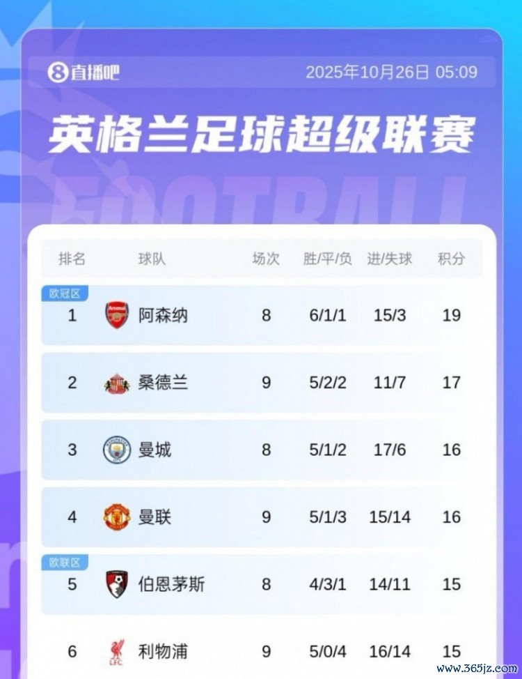 直播吧10月26日讯2025-26赛季英超第9轮,曼联4-2征服布莱顿,升至积分榜第4,暂时和榜首的阿森纳收支3分。