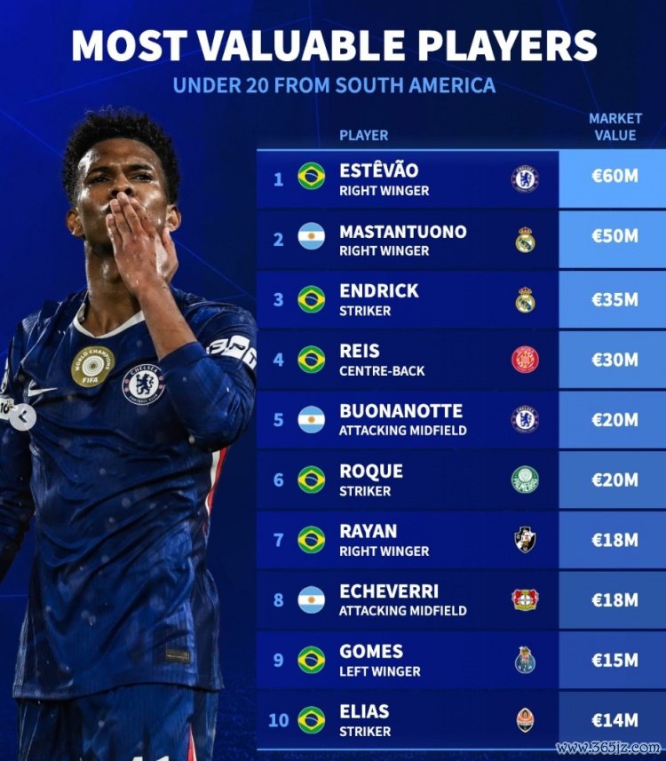 10月30日讯 《转会商场》统计了南好意思籍U20球员身价情况,切尔西新星埃斯特旺领跑。