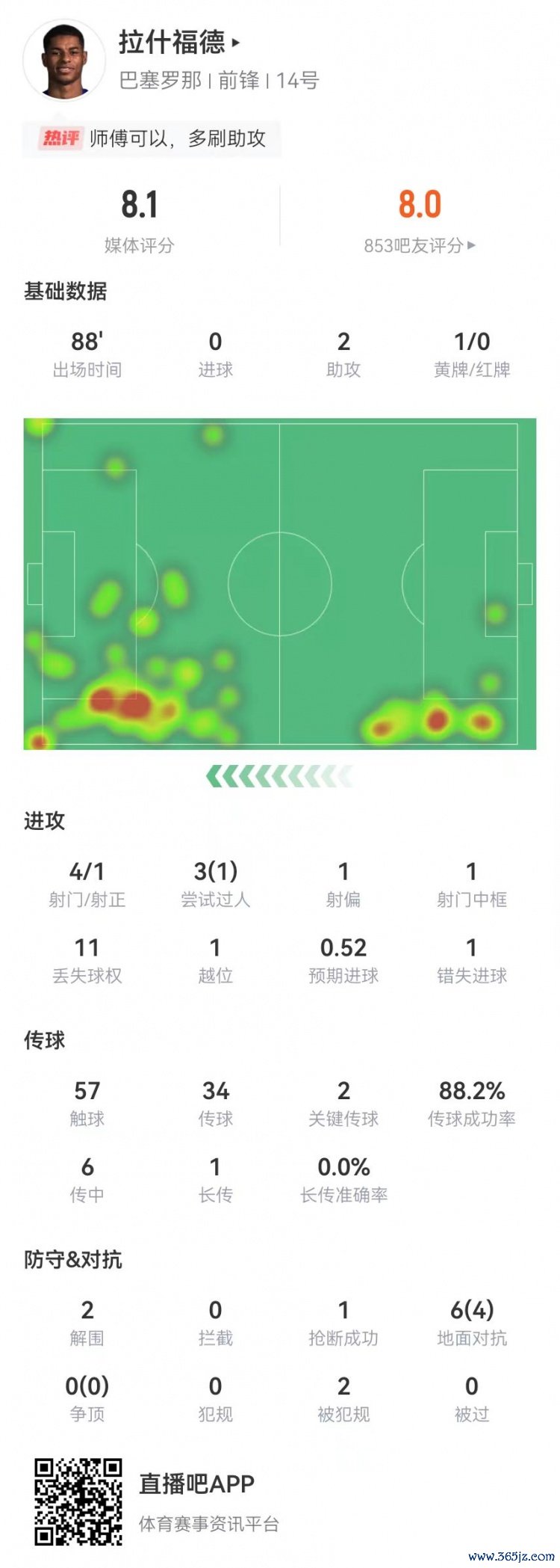 拉什福德本场2助攻+2关节传球 4射1正1中框+6传中 获评8.1分