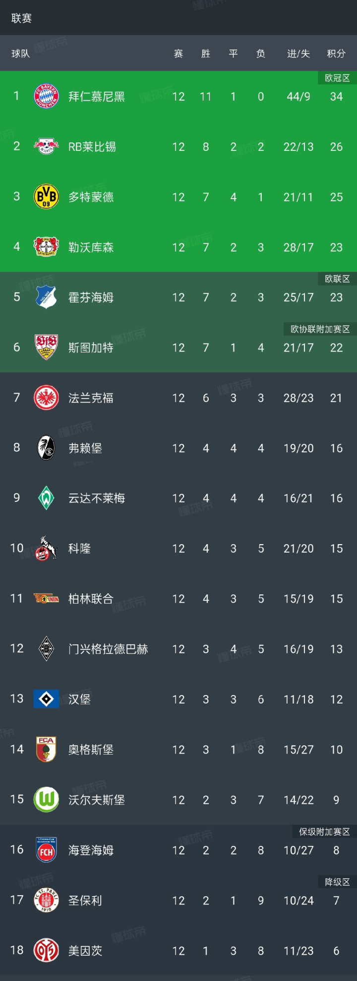 德甲积分榜拜仁慕尼黑鹤立鸡群。