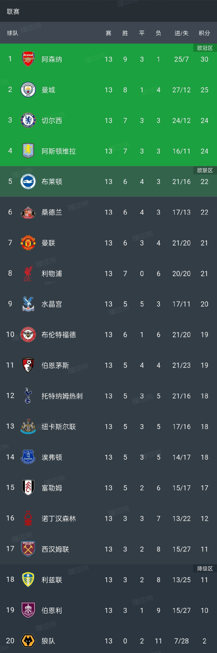 英超积分榜阿森纳5分领跑。曼城有契机了。