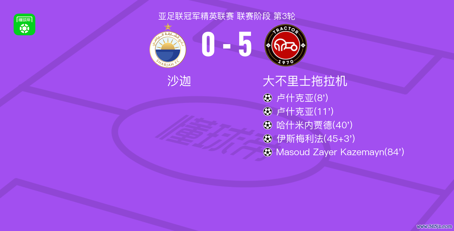 北京时辰10月21日亚足联冠军精英联赛 联赛阶段 第3轮,沙迦对阵大不里士混沌机。大不里士混沌机卢什克亚梅开二度,哈什米内贾德破门,伊斯梅利法破门,Masoud Zayer Kazemayn破门。最终比分沙迦 0-5 大不里士混沌机。