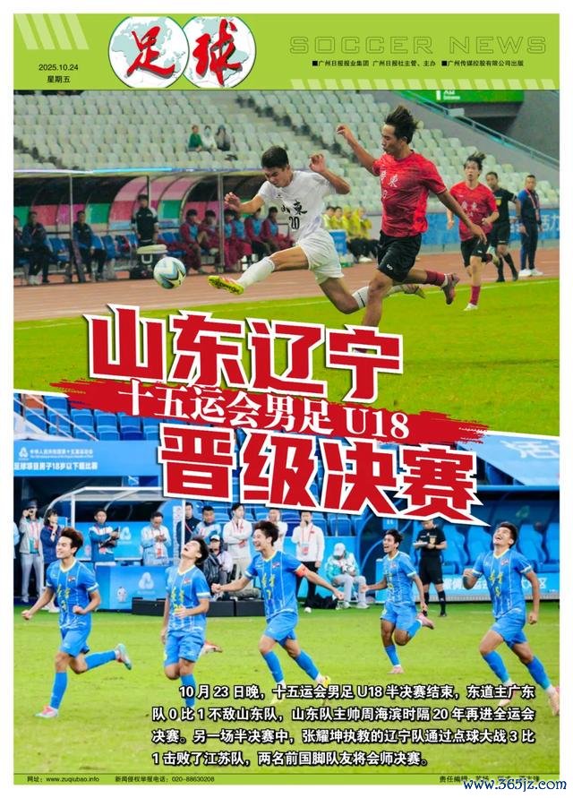 记者王伟报谈10月23日晚,十五运会男足U18半决赛逼迫,人广东队0比1不敌山东队,山东队主帅周海滨时隔20年再进全运会决赛。另一场半决赛中,张耀坤执教的辽宁队通过点球大战3比1打败了江苏队,两名前国脚队友将会师决赛。