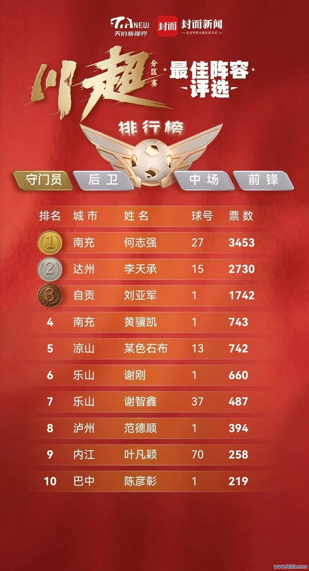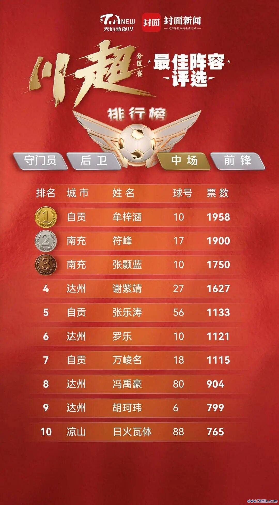 柔软“天府新视界”微信公众号,恢复关键词“川超投票”,即可赢得投票相连,为你因循的球员助力。每东说念主每天有11票,每天只可给每个球员投1票,按照(1位守门员、4位后卫、3位中场、3位时尚)声势,为11位球员投票。